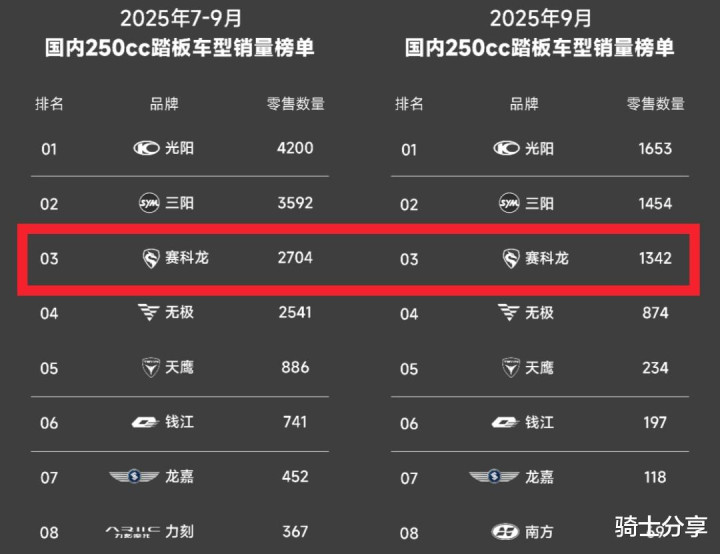无独有偶赛科龙在国产250cc踏板车,销售榜单中也有不俗表现,它2025年7~9月份售出了2704台。光9月份就卖出了1342台,其中RT250贡献了不小的份额,这再次验证了其高人气所带来的高销量。