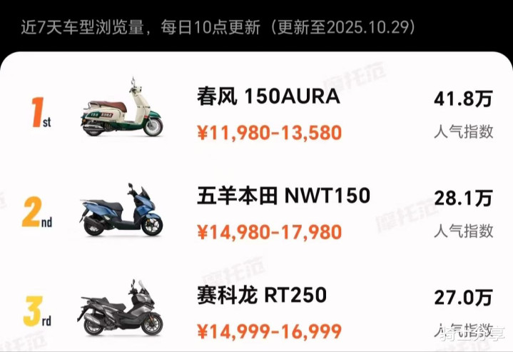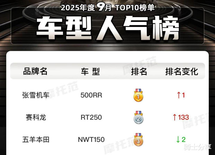 从“摩托范”最新数据来看,2025年9月份全种类车型高人气排名前三的车型分别是张雪500RR、赛科龙RT250、五羊本田NWT150。其中排名第二的赛科龙RT250人气出现了几何倍的增长,10月份直接成为了250cc人气王者,实属有点意外。